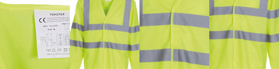 Conforms to EN ISO20471:2013 Class 3. Two 5cm reflective tape band and braces configuration with two bands encircling the full length sleeves. Touch and close front Velcro fastening.