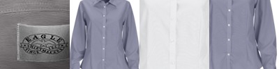 3.4 oz., 55% cotton, 45% polyester; Fine yarn count shirting; True Non-iron performance straight from the dryer; stain release finish; Active Fit; Patented pucker-free taped seams; Fused collar, cuffs, and placket; Split back seam with bias cut back yoke; straight collar; pearlized buttons; front and back princess seams for a flattering feminine fit; bust darts for a flattering feminine fit;