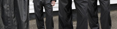 100% polyester with PVC inner coating. Waterproof 2000mm with taped seams.Windproof.Elasticated waistband.Waist vents to access inner pockets.Open leg ends with snap adjusters.Cut out label.