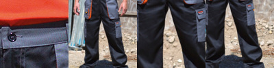80% polyester/20% cotton twill. Water repellent, windproof and breathable.Double tab belt loops.Partially elasticated waistband.Zip fly with button over.Two side pockets.Rear pocket.Multi-use cargo pockets with reflective tear release tabs.Bar tack stress points.