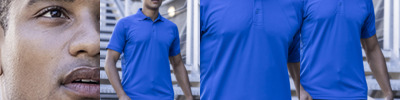 4.8 oz., 100% polyester mini-jacquard; Anti-bacterial; Moisture-wicking; Stain-resistant; UV 15-39 protection; Relaxed fit; Flat-knit collar;