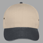 65% Polyester 35% CottonStructured Firm Front Panel Low-Fitting 6 panel cap Seamed Front Panel with Full Buckram 4 Brass Eyelets Flat Visor 8 Rows Stitching on Visor Matching Fabric Undervisor Matching Color Sweatband Adjustable Strap with Bronze Buckle and Bronze Grommet Insert Size:OSFM -Adult (58cm/22.8")