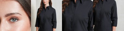 65% polyester/35% cotton poplin. Easy care fabric.Soft collar.Fitted style with bust and back darts.3/4 length sleeves with vented cuffs.Light blue and white have pearlised buttons - rest have self colour.Double folded seams.Curved hem.