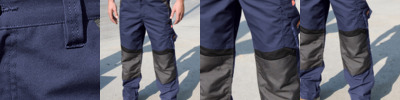 65% polyester/35% cotton. Polyester contrast trim.Water repellent and windproof.Expandable waistband with belt loops.Zip fly with rivet closure.Two side pockets.Rear pockets.Waterproof zip pocket.Left thigh media pocket.Cargo multi-use tool pocket.Knee pad pockets.Triple stitched seams.Bar tacked pockets and stress points.Decorative reflective detail.60°C wash.