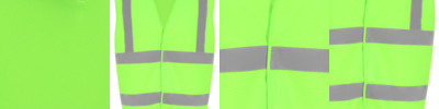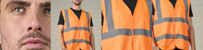 100% polyester. Conforms to EN 1150: 1999 (yellow and orange only).Self colour bound edges.Tear release front closure.Two reflective bands around the body and one over each shoulder.
