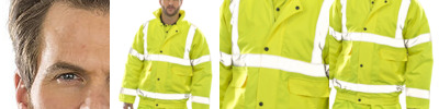 EN471 Specification Class 3 approved. EN343 approved. Fully taped waterproof seams. Tough and durable. Waterproof. Windproof. Excellent warmth factor. Comfort fit. Fully taped waterproof seams. Concealed hood with drawstring adjuster. Heavy duty full front zip fastening. Stud closing storm flap. One inside right pocket. Elasticated waist band. 50mm sewn on safety tapes. Two side pockets with over flaps protection. SIZE S - 38" M - 41" L - 42" XL - 47" XXL - 50" 3XL - 53"