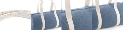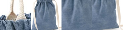 100% soft cotton denim. Grab handle/hanging loops.Cotton webbing carry handles.Drawcord closure.Tear out label.Capacity 12 litres.