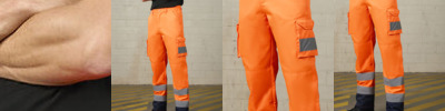 Certified EN ISO 20471:2013+A1:2016. RIS-3279-TOM ISSUE 1:2016 (Orange only). HV Orange/Navy & HV Yellow/Navy - Class 1. Navy - Non Certified. Water-repellent finish. Side elasticated waistband with 7 belt loops. Zip fly fastening. 2 side seam pockets. 2 cargo pockets. 1 rear pocket with tear and release fastening. Internal knee pad pockets. 2 bands reflective tape around leg.