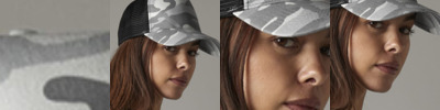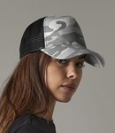 100% cotton front panel and peak. Polyester mesh rear panels.Camouflage detailing.5 panel.Pre-curved peak.Retro style snapback size adjuster.Tear out label.