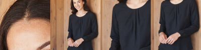 Pleat front blouse. Single button back neck opening. Set-in long sleeve. Slightly gathered sleeve at cuff with keyhole opening and button fastening. Slightly curved hem. Fabric contains easy care, wicking, anti UV, quick-drying properties.