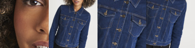 99% cotton/1% elastane. Stretch denim. Cropped ladies fit. Classic denim jacket panelling. Hanging loop. Shank button closure. Two chest pockets with flap closure. Two front pockets. Single button cuffs. Contrast twin needle stitching.