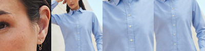 77% cotton/23% polyester. Wrinkle resistant fabric.Ladies fit with shaped side seams.Pearlised buttons.Two button adjustable cuffs.Curved hem.