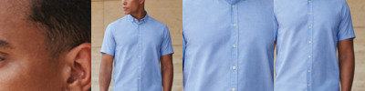 70% cotton/30% polyester. Wrinkle resistant fabric.Modern regular fit.Short point button down collar.Pearlised buttons.Back yoke.Twin needle side seams.Curved hem.Tag free.