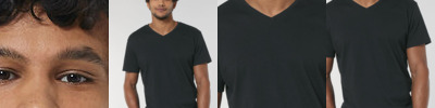 Set-in sleeve. self-fabric at neck collar. Inside back neck tape in self-fabric. Sleeve hem and bottom hem with narrow double topstitch. Men's, medium fit, short sleeve, v-neck. 100% organic ringspun combed cotton. Single Jersey. Fabric washed.