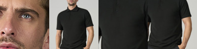 7.1 oz/yd² / 240 gsm, 91% polyester, 9% spandex jersey; Moisture wicking; UV protection; Self fabric collar with integrated collar stand and built-in collar stays; Side vents; Luxury, comfort and performance in one; Three-button placket; Dyed-to-match buttons;