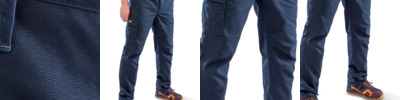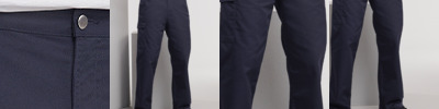 65% polyester/35% cotton twill. Extendable waistband with belt loops.Zip fly with stud button over.Two side pockets.Rear pockets with flaps.Media pocket.Cargo pocket on right leg.