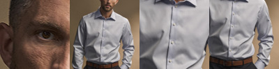 100% yarn dyed cotton twill 100/2. Easy iron fabric.Fused cut away collar.Pearlised buttons.Back yoke.Back darts.Two button adjustable cuffs with button on cuff gauntlet.Curved hem.
