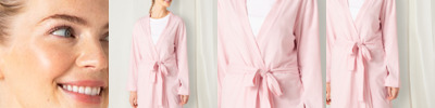 85% cotton/15% viscose. Kimono style robe.Lightweight fabric.Soft on skin.Tie front.Short style.KEEP AWAY FROM FIRE.