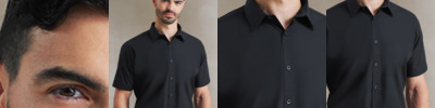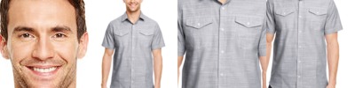2.8 oz. 55/45 cotton/polyester; 2 chest pockets with button flaps; Hem sleeves ; Chainstitching on bottom hem; Modern Fit;