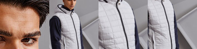 Contrast coil zip on centre front with signature zip puller and mouse tail piping on each side of zip opening. Front and back square stitched baffles with linear side narrow baffles. 250gsm lightweight polyester fill. Fully-lined in tonal polyester. Inset welt pocket with concealed zip opening and double zip garages. Contrast stretch binding on hem, armholes and hood opening. Internal piping around inside facing. Secure hood attached to collar. Internal welt pocket. Internal zipped opening on back panel for embroidery access. Product contains no branded neck label.* Removable Kimble or looped garment tags. Inner seam label holds important product information on one label with a second label containing brand information which can be cut-away.