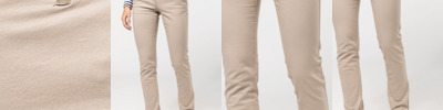 98% cotton twill/2% elastane. Enzyme washed.Modern style.Flat front.Belt loops.Zip fly with button over.Two side pockets.Ticket and coin pocket.Rear piped pockets.
