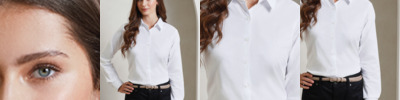 70% cotton/30% polyester. Easy care fabric.Wrinkle resistant finish.Fitted style with bust and back darts.Soft collar styling.Light blue and white have pearlised buttons - rest have self colour.Curved hem.Easy cut out neck label.