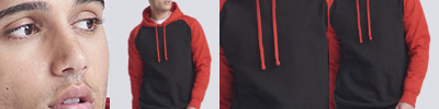 Charcoal 52% ringspun cotton/48% polyester. Soft cotton faced fabric.Brushed back fleece.Contrast raglan sleeves.Contrast double fabric hood with flat lace drawcord.Front pouch pocket.Ribbed cuffs and hem.Twin needle stitching.Tear out label.