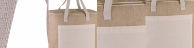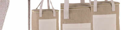 Jute canvas/cotton. Cotton carry handles.Aluminium lining and high density insulating foam.Front pocket for easy decoration access.Capacity 12 litres.