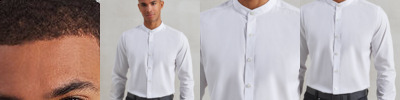 Long sleeve unisex shirt. Double button cuff and sleeve guard. Typical banded grandad collar with top button fastening. Easycare fabric.