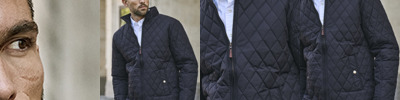310T nylon outer. Polyester padding and lining.Showerproof and breathable.Tailored classic fit.Corduroy lined collar.Full length covered brass zip.Inner pocket.Two front pockets with brass stud closure.Elbow patches.Rear vents with brass stud closure.Branded zip pull and brass studs.Bound cuffs with stud closure.Bound open hem.Access for decoration.