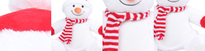 100% polyester. Soft plush snowman with contrast knitted scarf.Sewn eyes and mouth.Contrast orange nose.Contrast hat and gloves.White coloured panel on tummy.Removable inner pad (body only).Zip access for decoration onto front panel.Suitable for embroidery, print and sublimation.