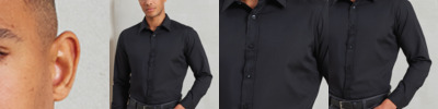 65% polyester/35% cotton poplin. Easy care fabric.Fitted style.Stiffened formal cut away collar.Two button adjustable cuffs with option for cuff links.Curved hem.