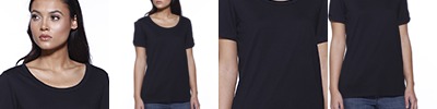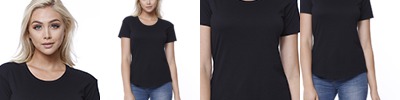 Rib crew neck with self-fabric back neck tape. Shaped side seams for a feminine fit. Fine knit gauge for enhanced printability.