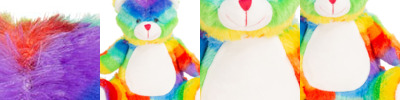 100% polyester. Soft plush multi coloured bear.White coloured panel on ears, nose, tummy and feet.Removable inner pad.Zip access for decoration onto front panel.Suitable for embroidery, print and sublimation.
