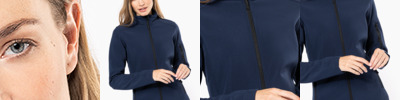 100% polyester heathered wicking knit top body, collar and sleeves ; 100% polyester wicking knit solid bottom body ; Ladies' fit ; Pad print label ; Quarter-zip pullover style; Self-fabric collar ; Set-in sleeves ;