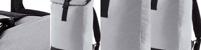 85% polyester/15% cotton. Lightweight yet durable. Reflective powder coating for enhanced visibility. Grab handle. Padded adjustable shoulder straps. Roll-top closure. Zip pocket. Tear out label. Capacity 15 litres.