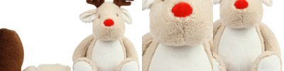 100% polyester. Soft plush brown reindeer.Red nose and contrast antlers.White coloured panel on ears, tummy and feet.Removable inner pad (body only).Zip access for decoration onto front panel.Suitable for embroidery, print and sublimation.