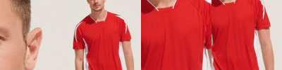 100% polyester. Self fabric collar with contrast piping. Raglan sleeves. Contrast mesh inserts on sides and sleeves. Longer back panel. Twin needle stitching. Suitable for sublimation printing.