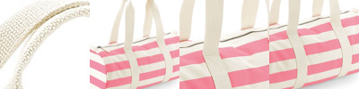 100% brushed cotton canvas. Printed stripe design.Webbing carry handles.Main zip compartment.Capacity 20 litres.
