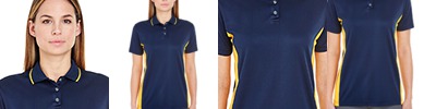 4 oz., 100% polyester mesh; Moisture-wicking; Pill-resistant; UPF 40+ protection; Feminine silhouette; Contrast tipping on knit collar; 3-button placket; Contrast side panels;