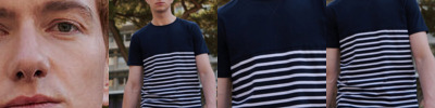 Tag free regular fit, heavyweight short sleeved t-shirt. Crew neck with stretch ribbed neckline. Twin-needle stitching at cuffs and hem. 'V' flatlock stitching detail at neck. Flatlock stitching at neck, shoulder seam and armholes. High chest seam. Striped lower body; contrast plain upper body and sleeves. Coordinates with FR134 long sleeved Breton T.