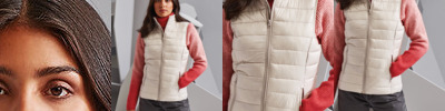 Tonal reverse coil zip on centre front with signature zip puller and internal storm flap with chin guard. Horizontal stitched sandwiched narrow baffles. Tonal reverse coil zip pockets with upper zip garages. Stretch binding around armholes for added protection. Side seam shaped panelling. Packable bag. Internal signature back neck hanger loop. 250gsm lightweight polyester fill. Inside binding around seams. Product contains no branded neck label.* Removable Kimble or looped garment tags. Inner seam label holds important product information on one label with a second label containing brand information which can be cut-away.