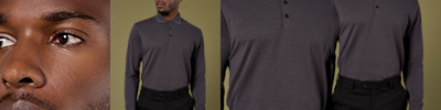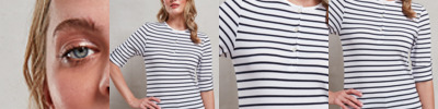 82% polyester/14% viscose/4% elastane. Single jersey.Easy care fabric.Soft and stretchy.White/navy has yarn dyed stripe.Three button placket.Roll-up sleeves with button and tab.Ribbed bound collar and cuffs.