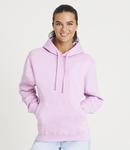 80% ringspun cotton/20% polyester. Soft cotton faced, marl effect fabric. Drop shoulder style. Double fabric hood with flat lace drawcord. Front pouch pocket. Ribbed cuffs and hem. Tear out label.