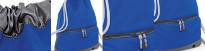 600D/420D polyester combination. Water resistant fabric.Chunky drawstring carry handles.Metal ventilation eyelets.Large main compartment.Shoe compartment/wet pocket.Water bottle holder.Tear out label.Capacity 18 litres.