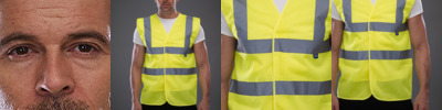 100% recycled polyester (some colours in transition). Breathable lightweight mesh knitted fabric.Conforms to ANSI/ISEA 107-2004 and EN ISO 20471: 2013 + A1: 2016 class 2.Tear release front closure.Two reflective bands around the body and one over each shoulder.Branded tab on left chest.