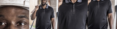 100% polyester. Made from at least 50% recycled polyester (in transition).Quick dry, moisture wicking performance fabric.Ribbed collar.Taped neck.Three button placket.Contrast shoulder and sleeve panels.Contrast lower side body inserts.Side vents.Twin needle sleeves and hem.Cut out label.