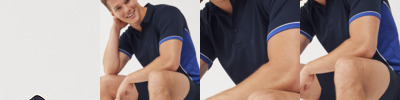 Shaped polo. Textured Birdseye wicking fabric. Shorter collar. Side panels and piping. Binding at sleeve cuffs.