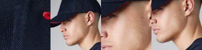 100% brushed cotton twill. 5 panel.Stitched ventilation eyelets.Pre-curved peak.Contrast panel design with piped trim.Rip-Strip™ size adjuster.