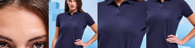 Women's classic fit polo. 2 button placket. Short sleeves. Side vents. Knitted collar and cuffs. Machine washable.